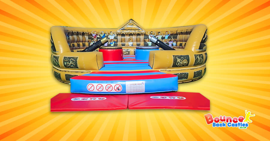 The inflatable features dual elevated platforms, a cushioned central arena and a non-slip access ramp, helping ensure fair and controlled play. Inflatable jousting poles and protective headgear are included with hire.