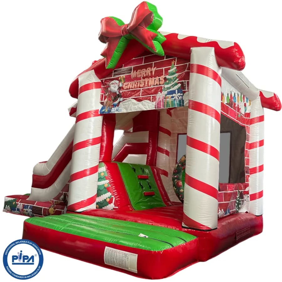 - Christmas themed bouncy castle with slide — red, green and white festive design
